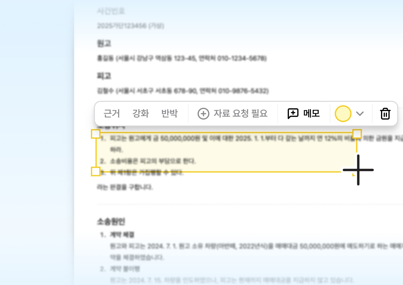 문서를 읽으며 중요한 부분을 드래그하여 즉시 서면의 재료로 리스트업 합니다.