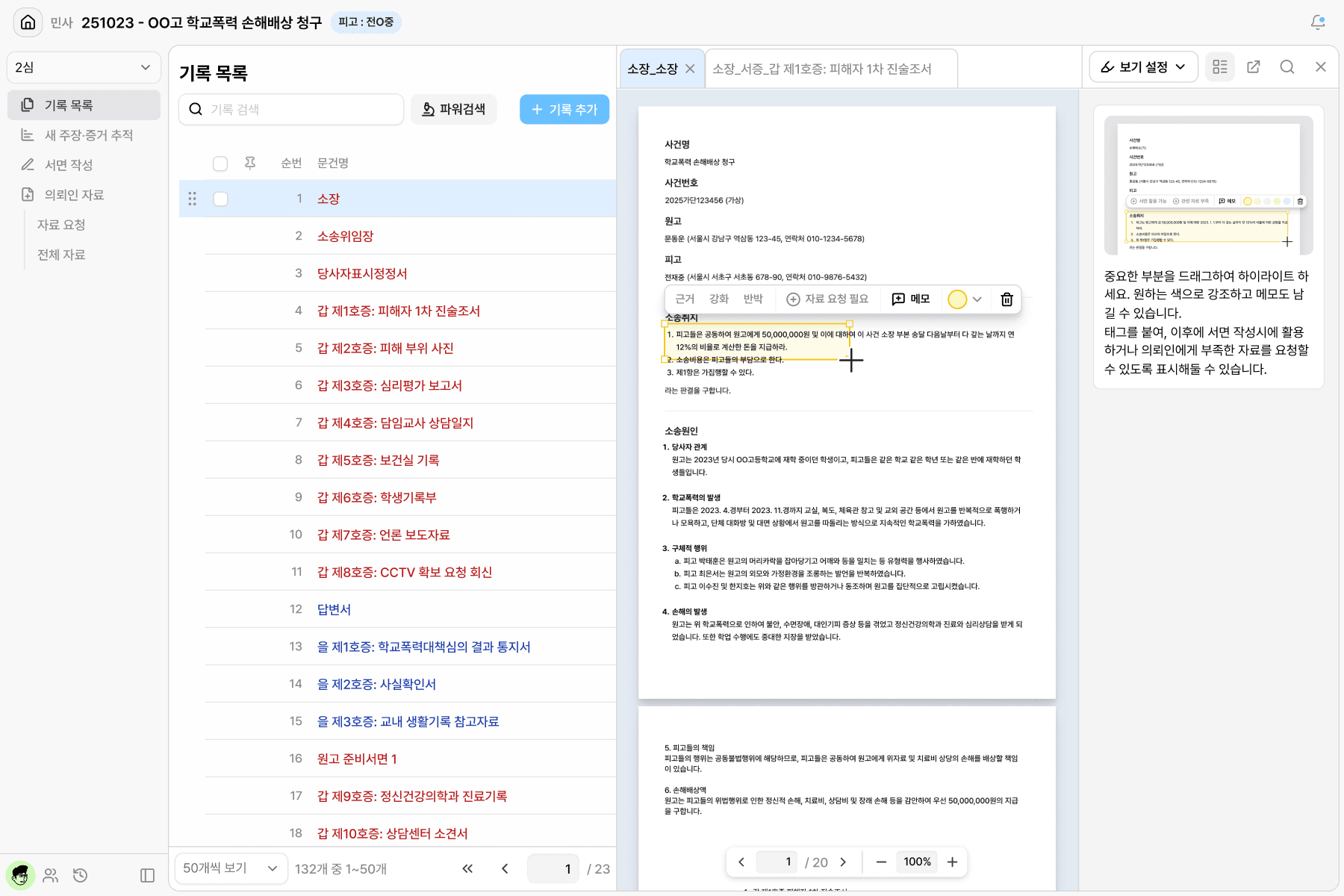 증거문서만 업로드하면 개별 사건의 모든 자료가 자동으로 정리 완료