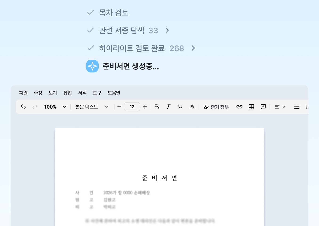 증거 내용이 완벽히 반영된 준비서면이 생성됩니다.
